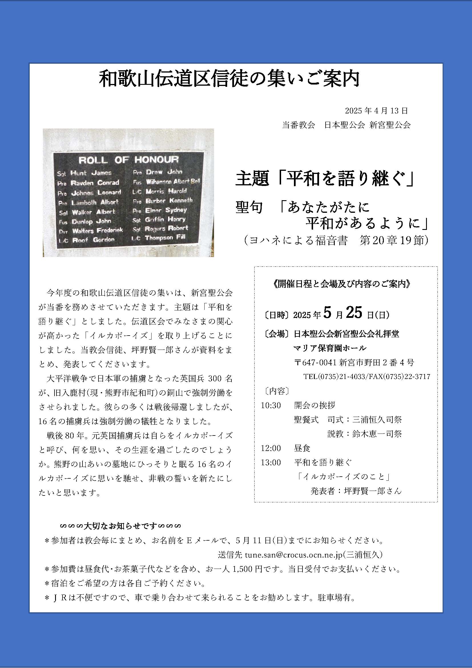 *参加者は教会毎にまとめ、お名前をEメールで、5月11日(日)までにお知らせください。 送信先tune.san@crocus.ocn.ne.jp(三浦恒久)